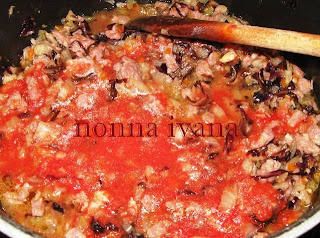 Quando il tutto è morbido e appassito si aggiunge un mezzo bicchiere di passata di pomodoro casalinga, non ne occorre molta, per non confondere i sapori, un po' d'acqua e si copre e si cuoce per un quarto d'ora!