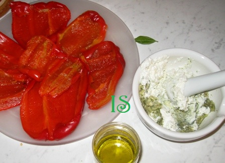 Due peperoni freschi, basilico del vaso in giardino, avanzo di mandorle e una scatolina di ricotta!